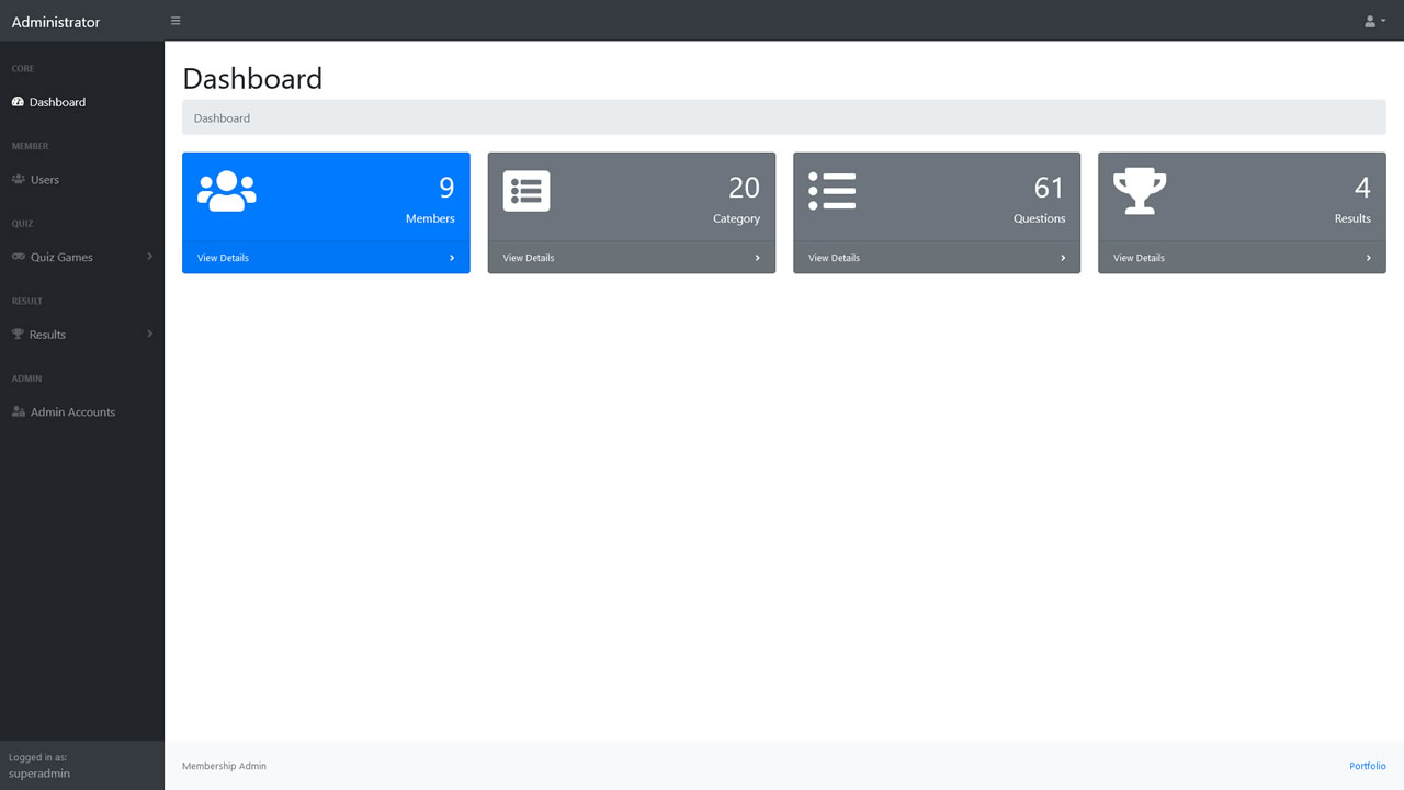 The Admin Dashboard provides full control over members, categories, questions, and results. It includes panels for Members, Categories, Questions, Media, Settings, Results, and Administrators, each offering clear summaries and easy management tools.