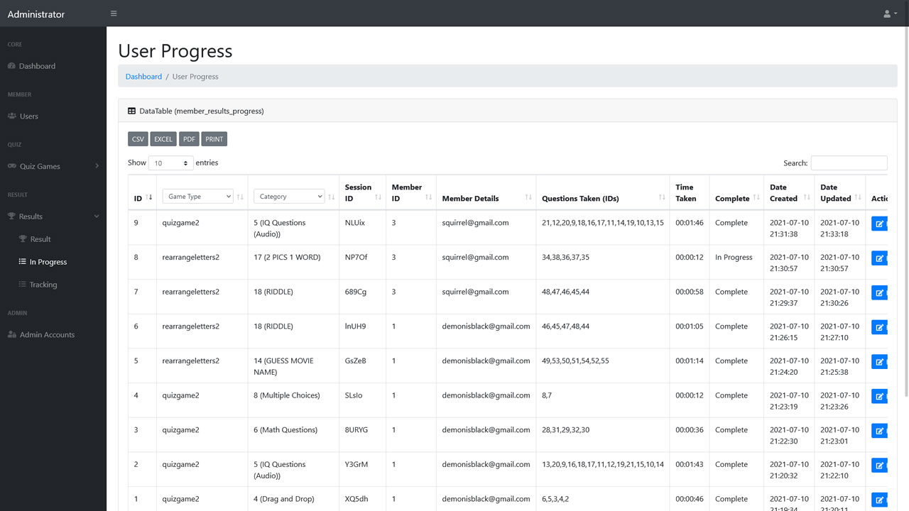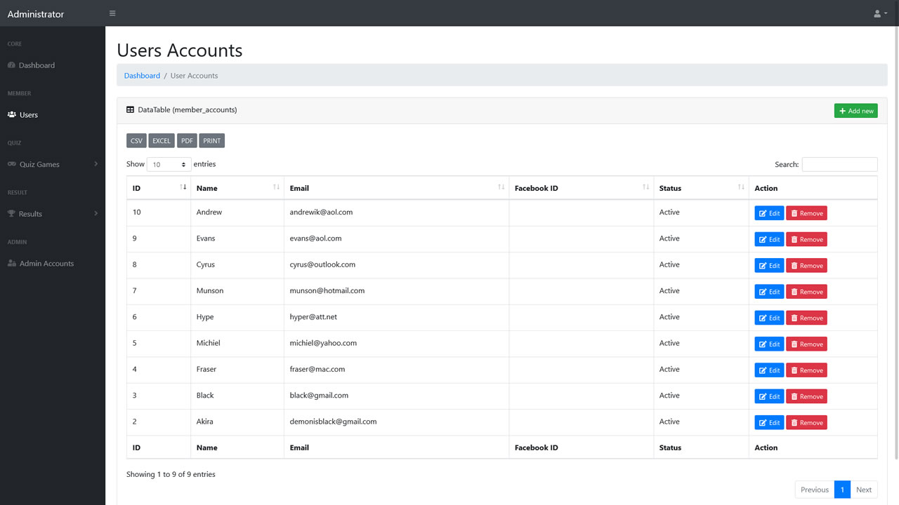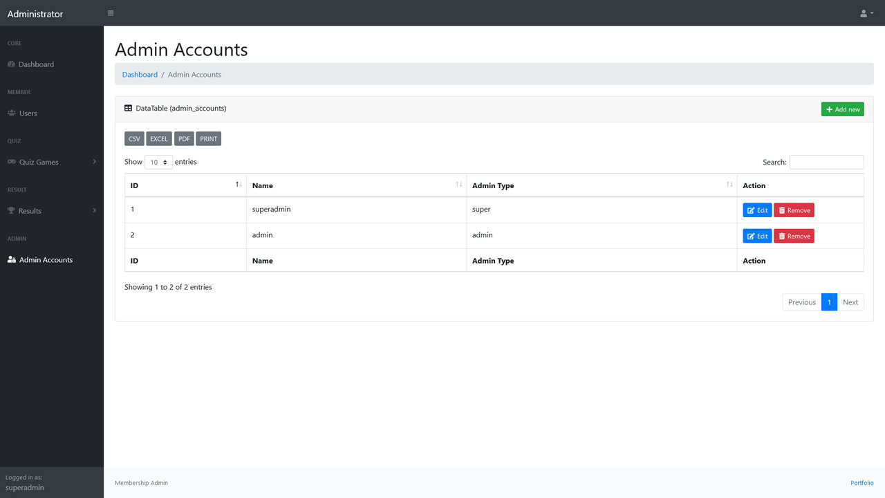 Datas can be export via admin (CSV, EXCEL, PDF, PRINT)