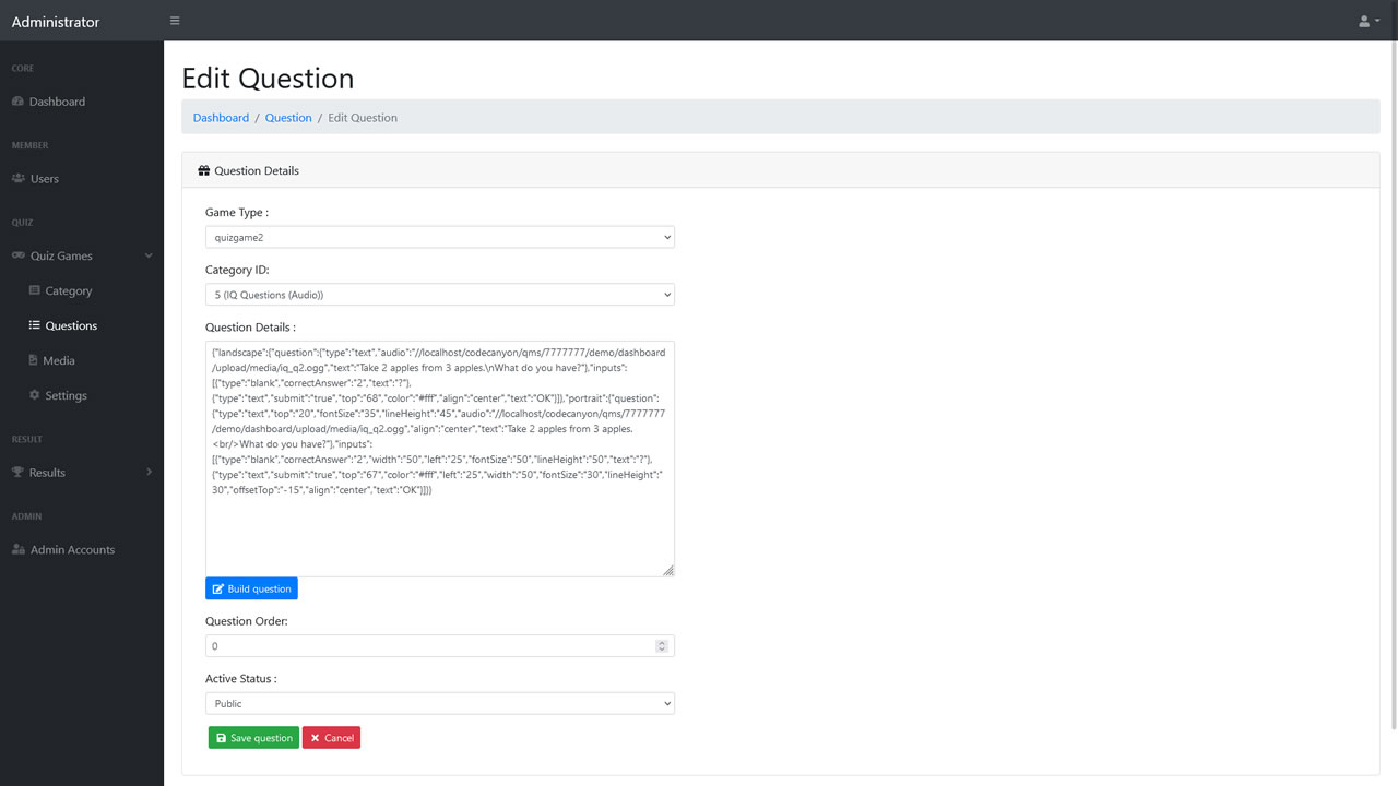 *IMPORTANT: All questions are no longer loaded from XML files. They must now be created using the built-in tool in the Admin Dashboard and saved as JSON data.