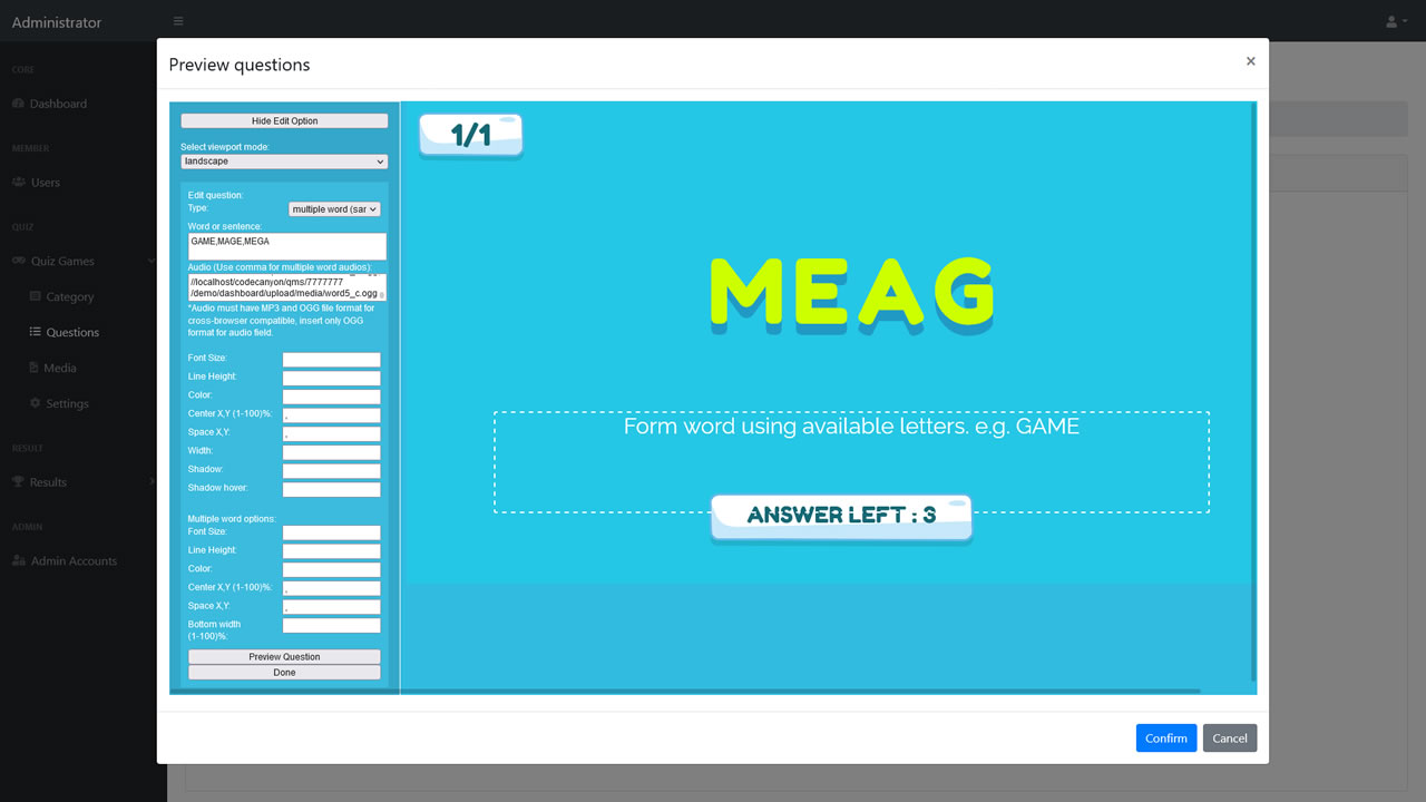 Rearrange Letters 2 is a HTML5 game where you can arrange the letters and make the right word by given description as a clue, it is rebuild without canvas which can support responsive for landscape and portrait layout, and include the new drag and drop sentence question.