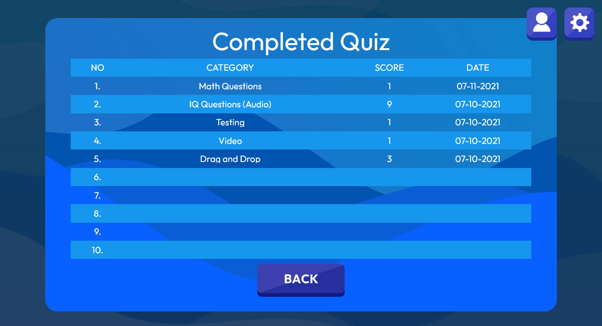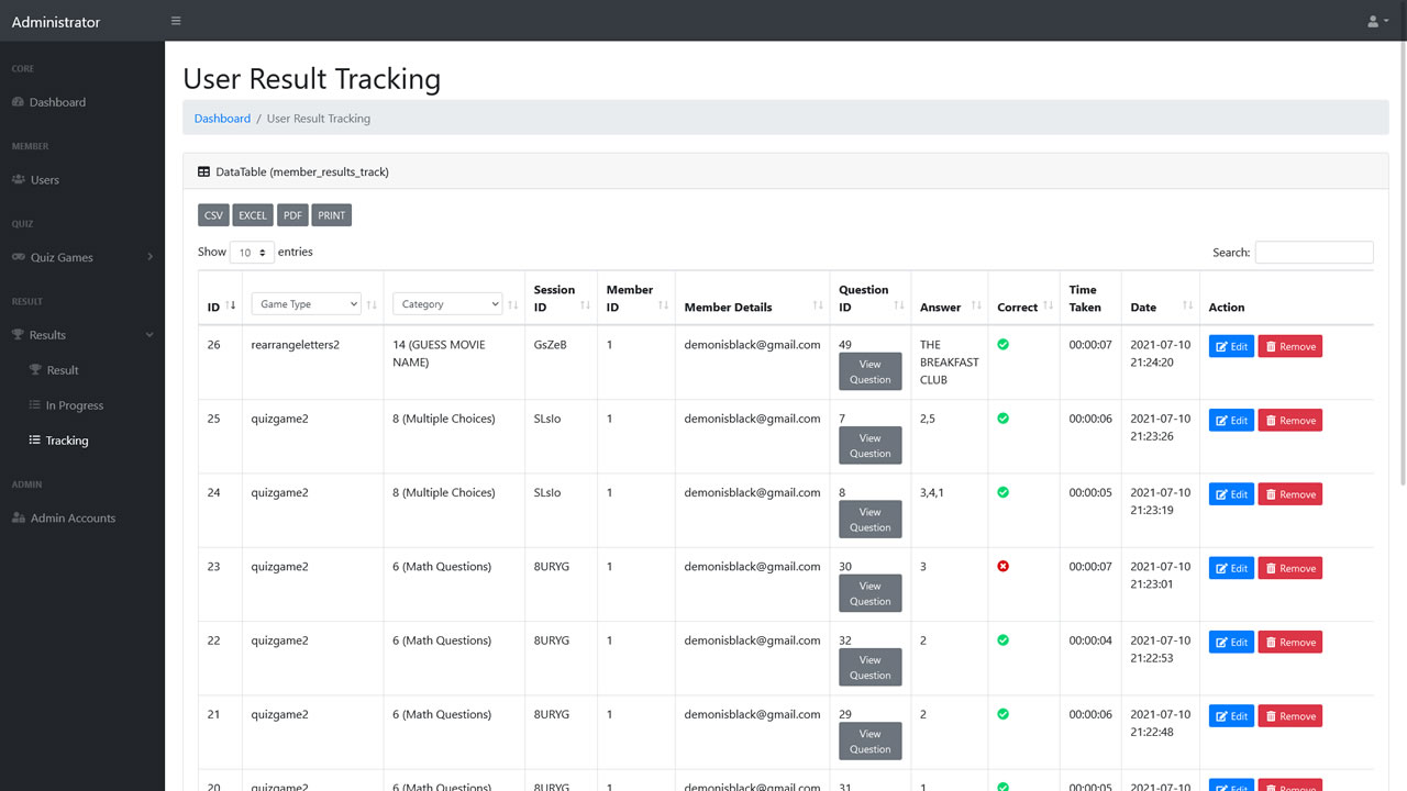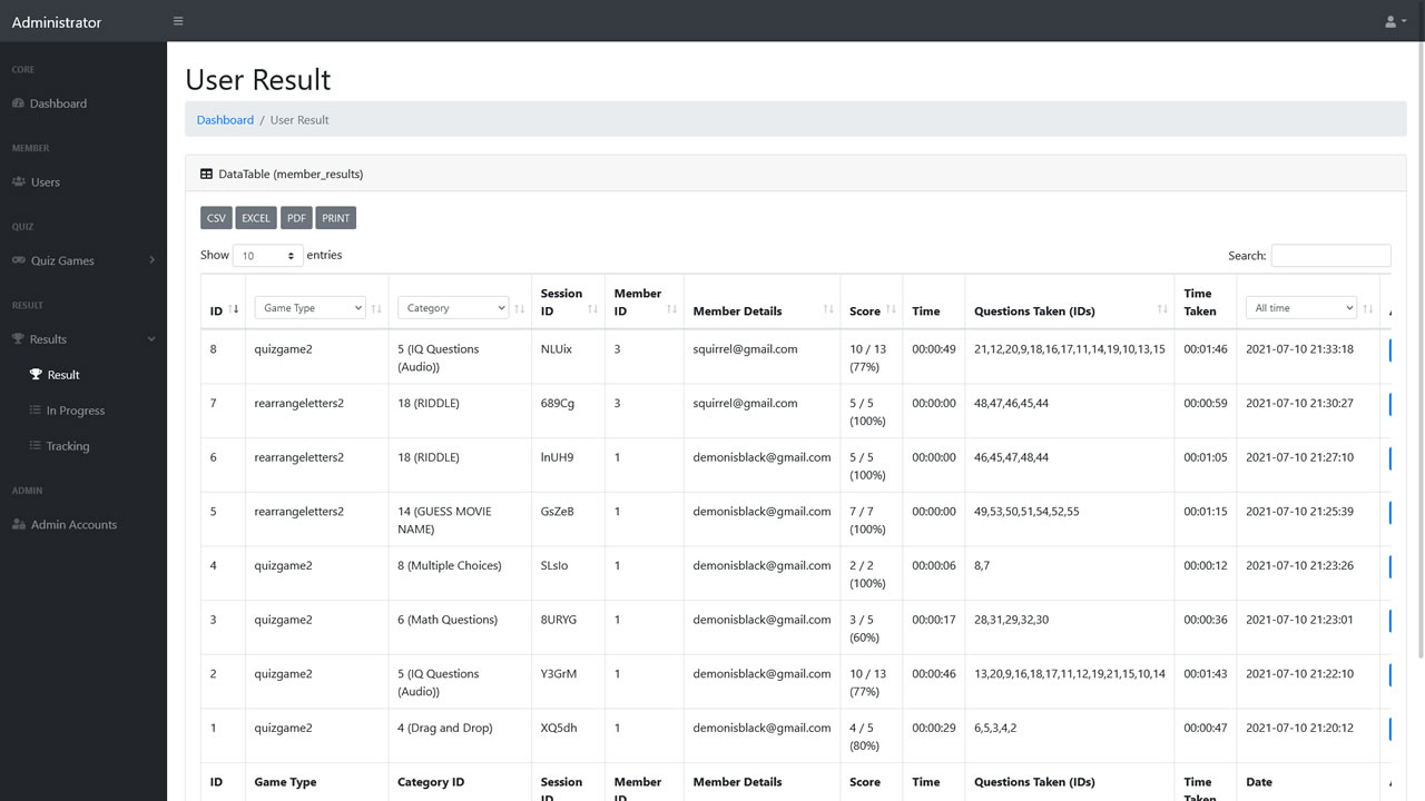 Private quizzes can also be created using access codes. Users enter a given code to join a private quiz that is not publicly listed. The Admin Dashboard lets you manage categories, questions, and media files, while also reviewing detailed reports of each player’s performance, including time taken, answers, and percentage scores.